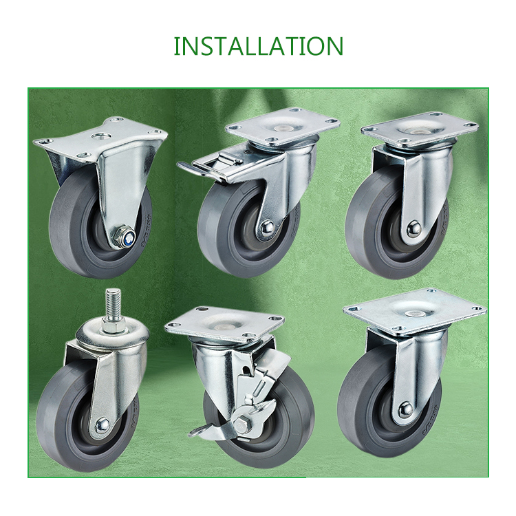 Application: Logistics Equipment, Medical Equipment, Supermarket Trolley, Cleaning Equipment, Furniture. Installation About the Fixings, you can choose it as your demand, such as flat plate swivel, bolt hole, threaded stem, round solid plug,expanding socket etc. We also provide personality service.