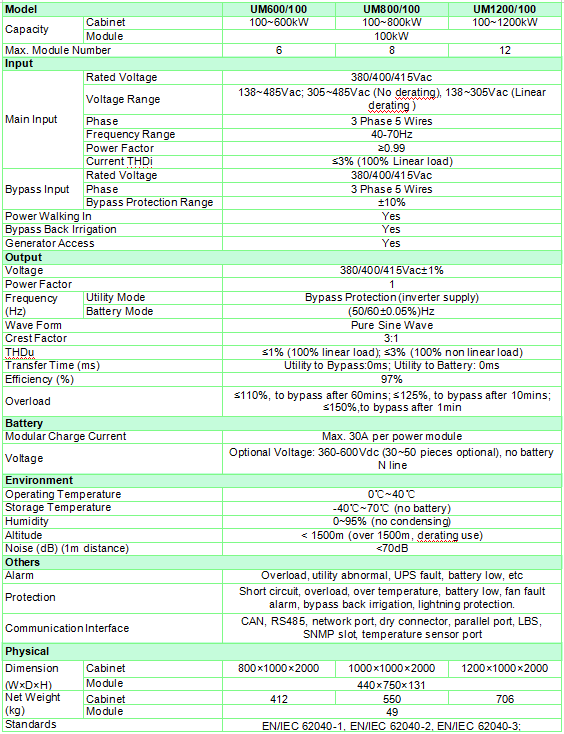The UM Series Modular Online UPS 100–1200kVA represents the newest generation of three-phase modular UPS with centralized bypass design. Adopting advanced DSP digital control technology, online double conversion UPS architecture, and N+X parallel redundancy, this series delivers outstanding performance, high efficiency, and maximum system availability. Its modular and scalable design allows users to flexibly expand from 100kVA to 1200kVA, and even up to 2400kVA in parallel, providing a truly future-proof modular UPS system for mission-critical infrastructures.