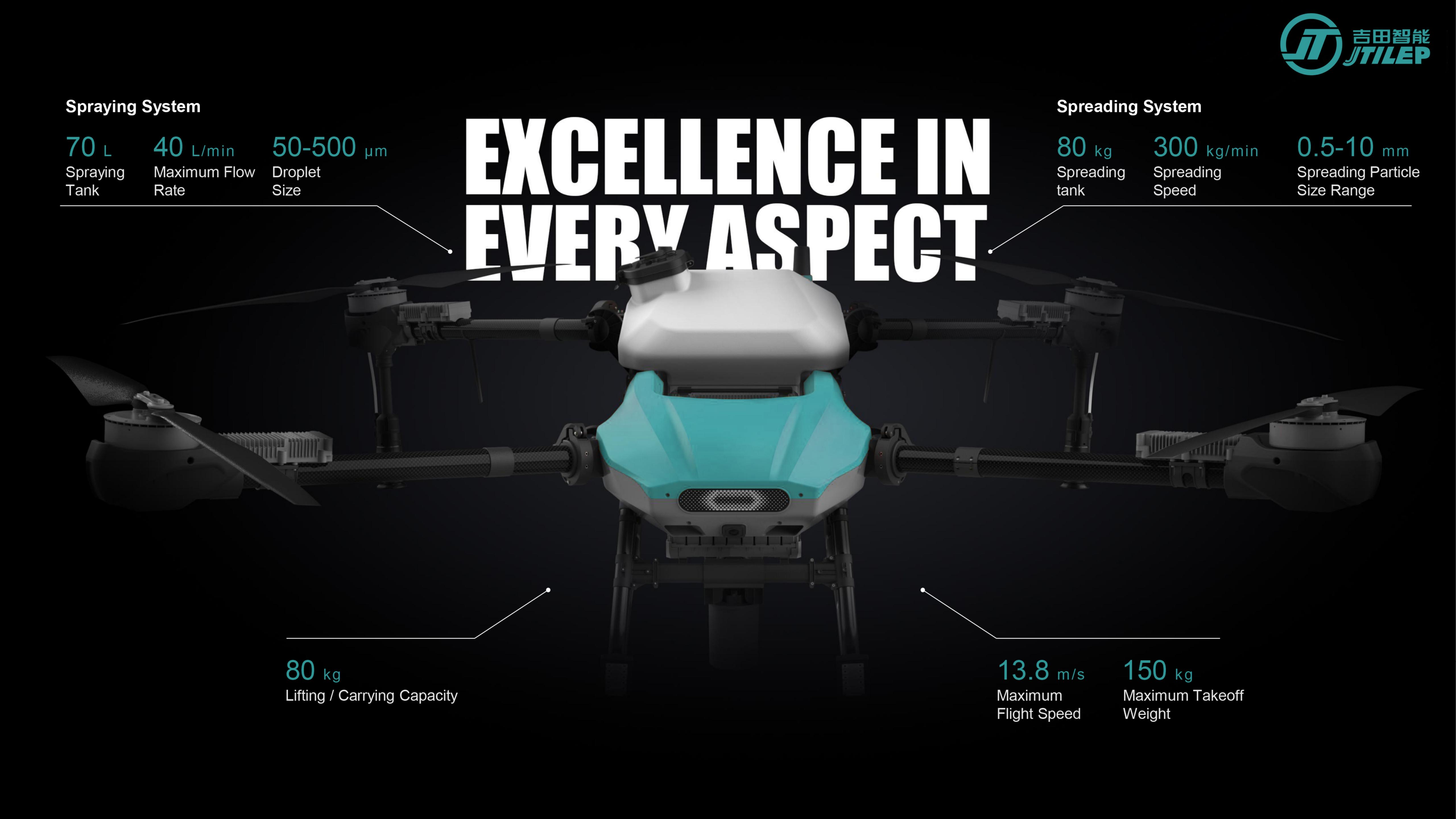 The drone is equipped with a 70-liter tank, making it suitable for large-scale spraying operations.