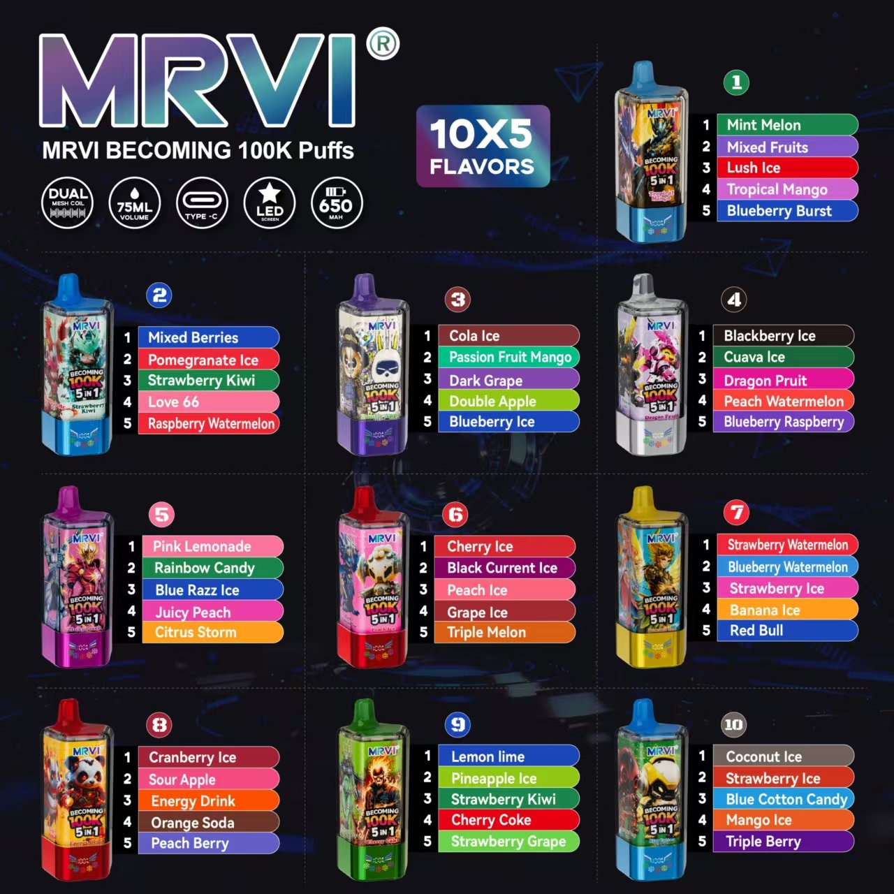 The MRVI 100K Puffs Disposable Vape is engineered for ultra-long performance, delivering exceptional flavor, massive vapor, and dependable power for heavy users. Designed with an advanced dual-mesh coil system, the MRVI 100K provides richer taste, faster heating, and smoother hits across its entire lifespan — no flavor drop, no burnt taste.