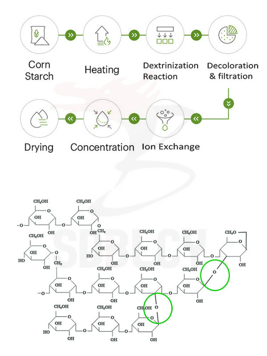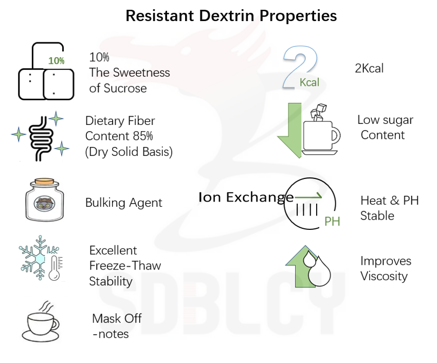 Resitant dextrin,known as Resistant maltodextrin or indigestible maltodextrin, is a soluble dietary fiber and can form a gelatin structure and retain moisture. Resitant dextrin is often used as a texture modifier. When devalue is 3 ~ 5, it can produce texture and taste similar to fat, and it is a high-quality fat substitute. Often used as salad, ice cream, sausages, and other fat substitutes. It can also play the role of substitute grease in powder grease.
