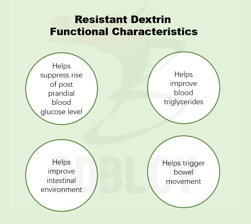 1.High dietary fiber content ≥85%(AOAC2001.03) 2.High solubility ≥75%以上(20℃) 3.High stability Heat and acid resistance 4.High anti-moisture performance 5.Low sweetness, only 10% of sugar 6.Low viscosity,about 15cps(30℃,30% solution) 7.Low water activity 8.Low calorie,about 1.7Kcal/g 9.Resistant maltodextrin Promote the absorption of calcium, magnesium, iron and zinc