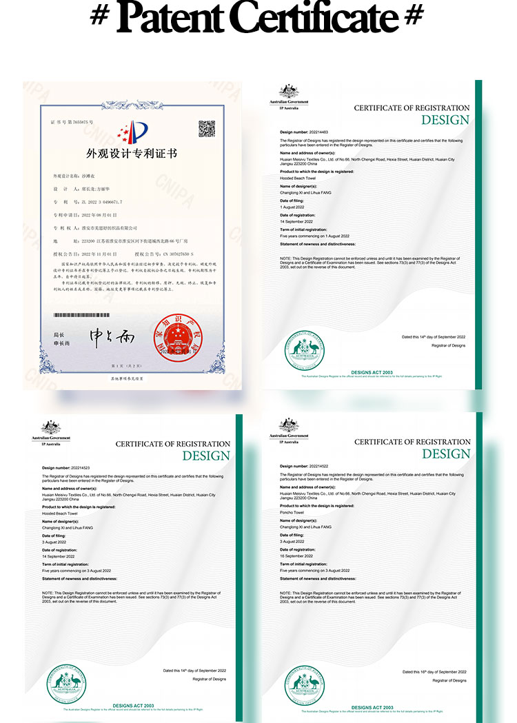 Meisiyu Textiles Co., Ltd. located in Huaian City, Jiangsu Province, our factory has the advanced technology and production equipment.Also we have our own professional designers to meet any of your requirements.Our main products are towels, bathrobes, fleece blankets poncho towels and waterproof changing robes, and our main material fabric are cotton, microfiber and organic bamboo.Our products have many appearance patents.
