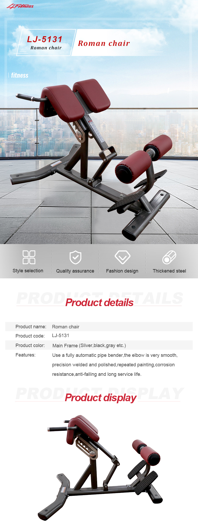 The Roman chair is a fitness equipment used to exercise the lower back, gluteus maximus, and abdominal muscles. This gym equipment adjustable roman chair is composed of a cushioned bench with a foot pedal and handle. The user places themselves on a bench, with their feet fixed under the foot pedals and their upper body hanging freely. Then, by lifting the upper body up and down while keeping the lower body stable, perform exercises such as back stretching or sit ups. The Roman chair can effectively train core strength.
