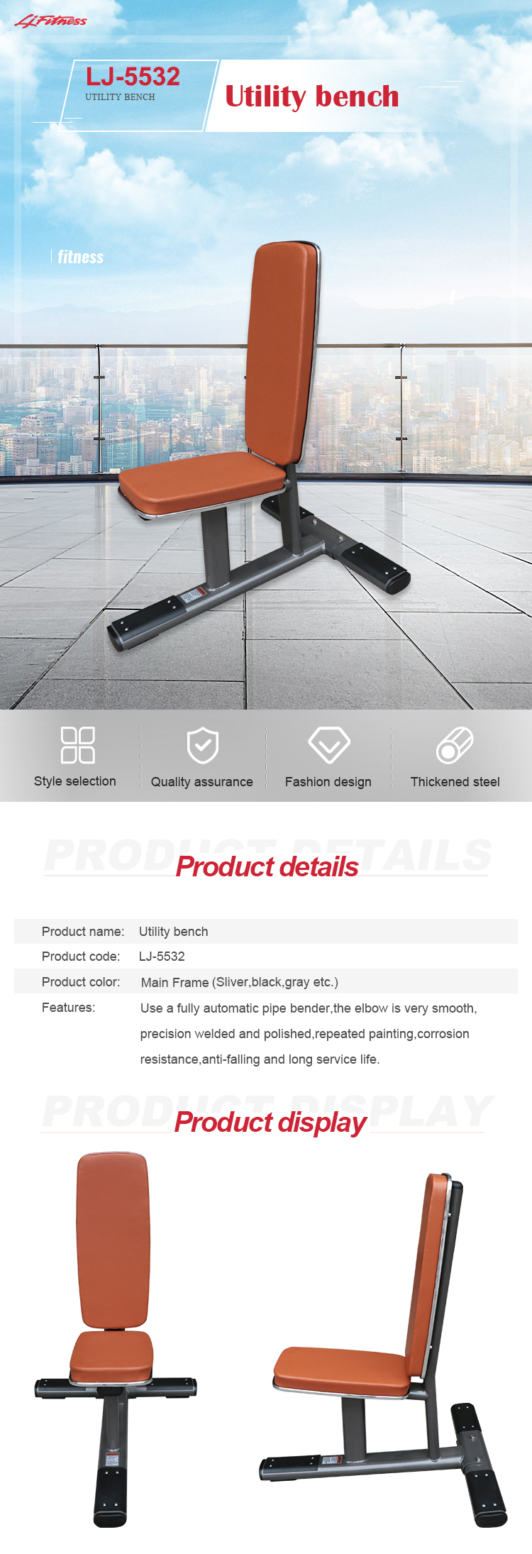The commerical gym equipment utility bench consists of a sturdy frame with a seat and backrest, allowing for various movements.
