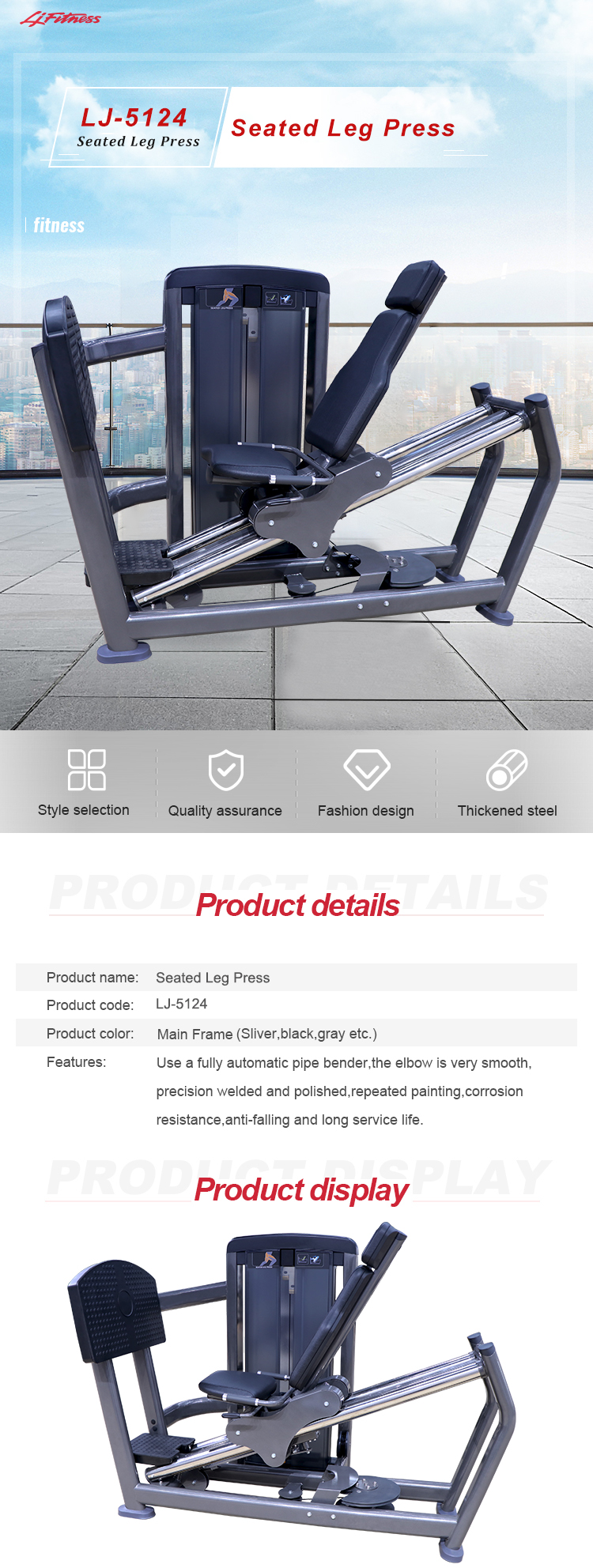 The seated leg press is a strength training exercise that primarily targets the muscles in the lower body, specifically the quadriceps, hamstrings, and glutes. It is performed using a leg press machine, where the individual is seated with their back against a padded backrest and their feet on a footplate.To perform the seated leg press:1. Adjust the seat height and backrest angle on the leg press machine to ensure proper alignment and comfort.2. Sit on the seat and place your feet shoulder-width apart on the footplate, with your knees bent at a 90-degree angle.3. Grasp the handles on the side of the seat for stability.4. Push the footplate away from your body by extending your legs, while keeping your heels on the footplate and your back against the backrest.5. Continue pushing the footplate until your legs are almost fully extended, but avoid locking your knees.6. Pause for a moment at the top of the movement, then slowly lower the footplate back to the starting position by bending your knees.7. Repeat for the desired number of repetitions.It is important to maintain proper form throughout the exercise, which includes keeping your back against the backrest, avoiding rounding or arching of the back, and ensuring that your knees do not cave in or go past your toes.The seated leg press can be adjusted to target different muscle groups by changing the foot placement on the footplate. Placing your feet higher on the footplate will engage the glutes and hamstrings more, while placing them lower will target the quadriceps. It is recommended to consult with a fitness professional or trainer to determine the appropriate weight and technique for your fitness level and goals.The commercial weight seated leg press curl gym equipment is a versatile machine designed to target and strengthen the muscles in the lower body, specifically the quadriceps, hamstrings, and glutes.This seated leg press curl gym equipment typically consists of a padded seat with a backrest and a footplate. The user sits on the seat with their back against the backrest and places their feet on the footplate. The user then pushes against the footplate to extend their legs, working the quadriceps muscles. To target the hamstrings, the user can adjust the machine to allow for a leg curl motion, where they bend their knees and curl their legs towards their buttocks.The commercial weight seated leg press curl gym equipment is usually equipped with a weight stack or weight plates, allowing users to adjust the resistance according to their fitness level and goals. It may also feature adjustable seat and footplate positions to accommodate users of different heights and leg lengths.Using this equipment can help build strength, increase muscle mass, improve lower body stability, and enhance overall athletic performance. It is commonly found in commercial gyms, fitness centers, and strength training facilities.