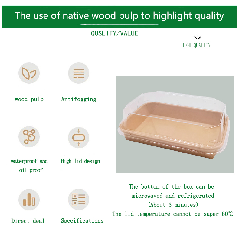 We use food grade kraft paper to ensure food safety. It is very environmentally friendly and can degrade.And we use thickened kraft paper, which can increase the strength of the kraft paper container and increase the water resistance of the product. Kraft containers can improve the stability and durability of the container.It also has certain waterproof and oil-proof properties.