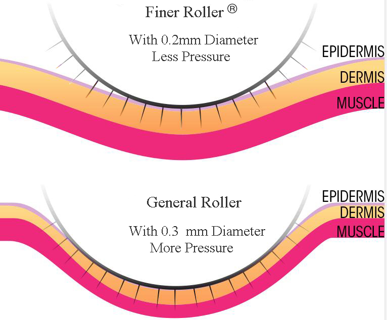 Compare to the general derma roller with diameter 0.35mm, the new 360 finer roller is made by rectangular pyramid needles with diameter 0.2mm, tip sharp between 0.01mm-0.02mm