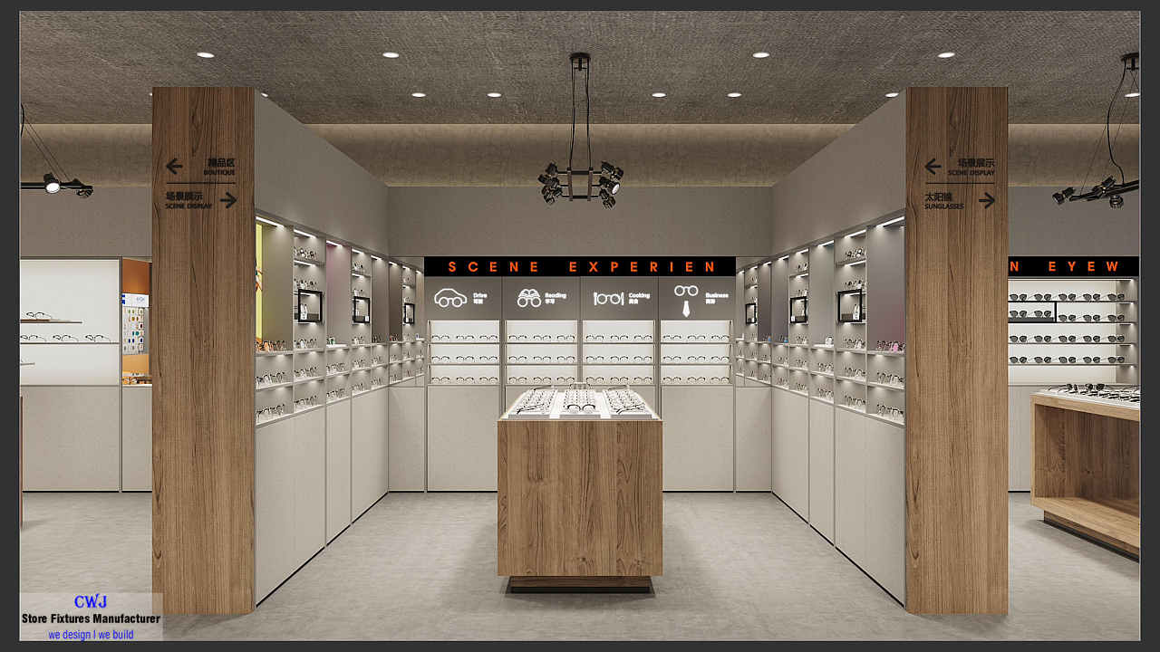 | Feature | 100% custom, provide full optical store fixtures and eyewear showcases |